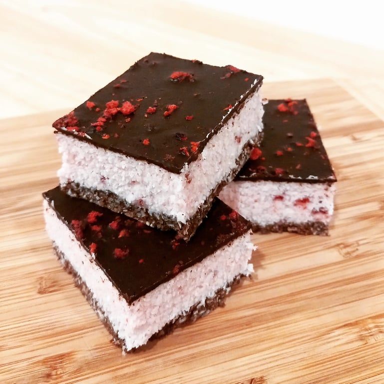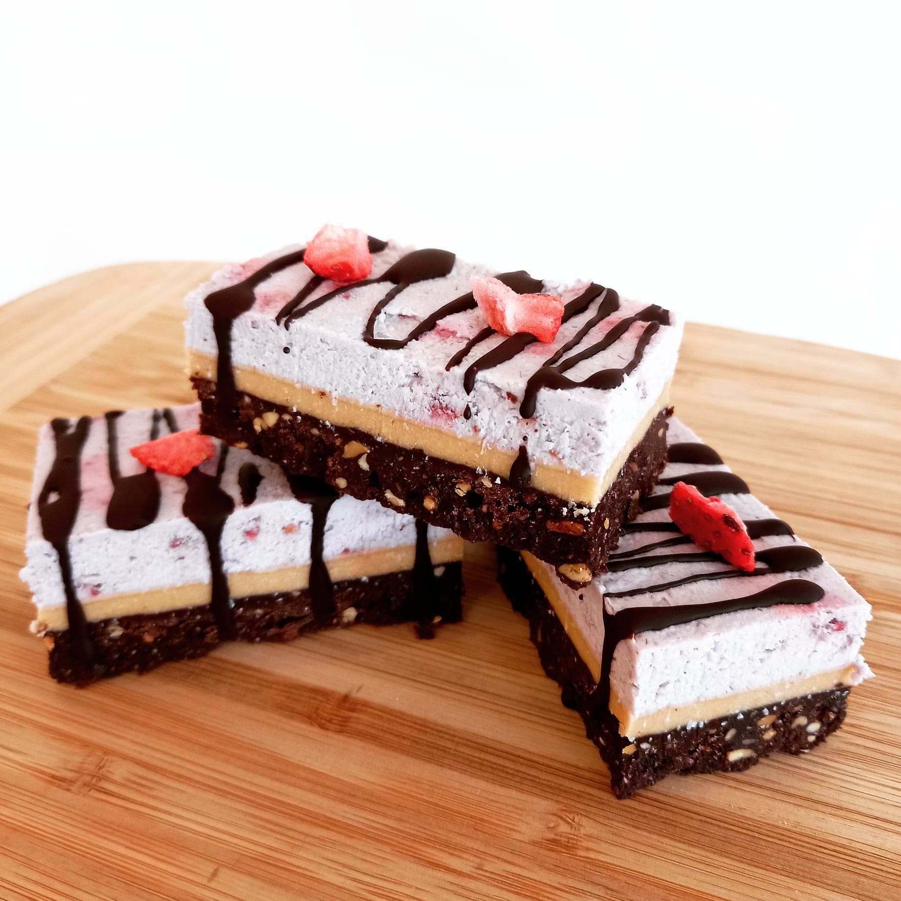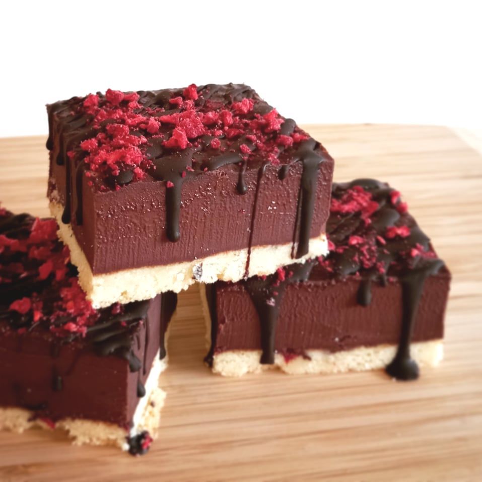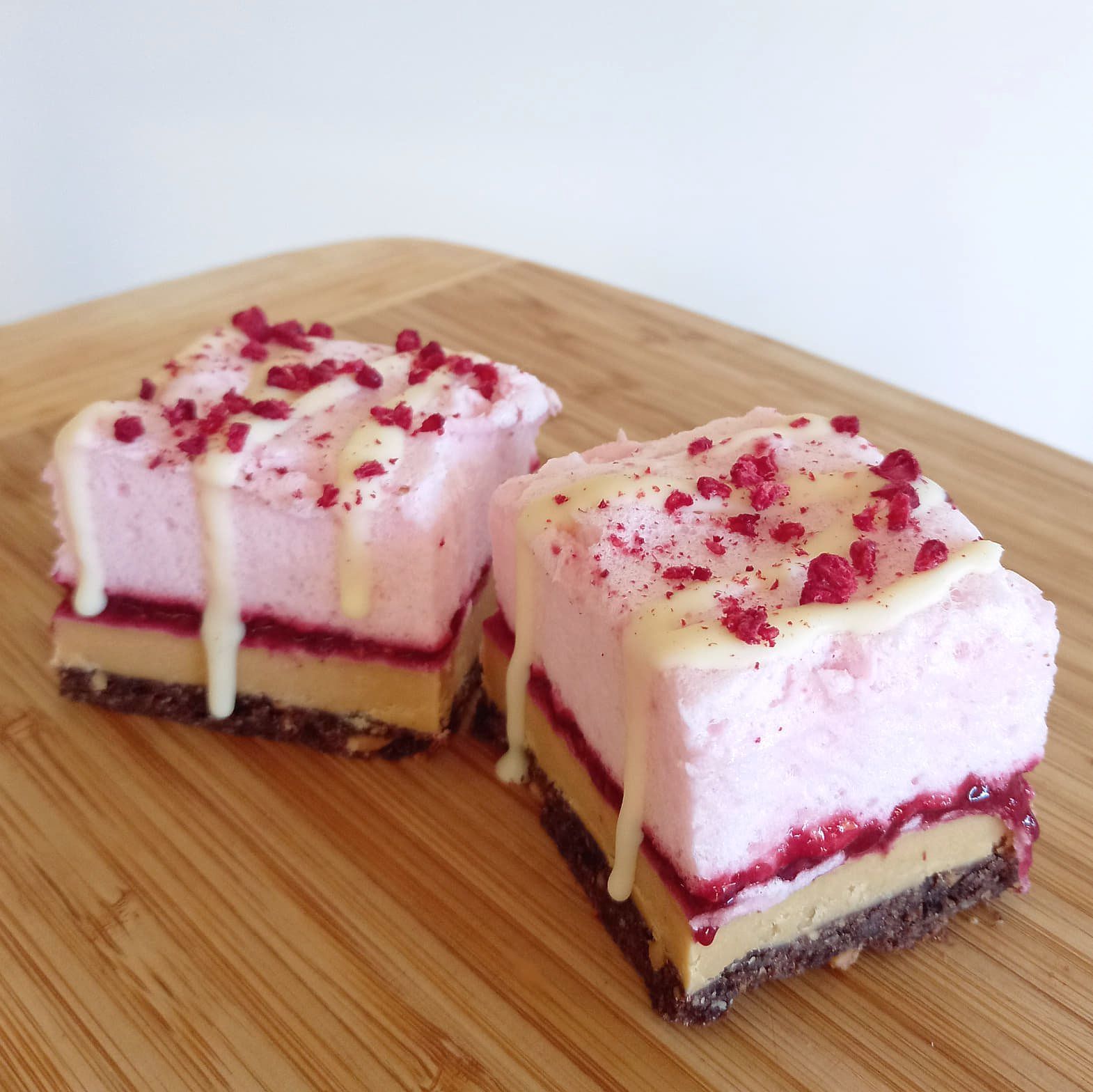 (nf) A chocolate coconut base, topped with a soft and creamy raspberry layer and finished with freeze dried raspberries!