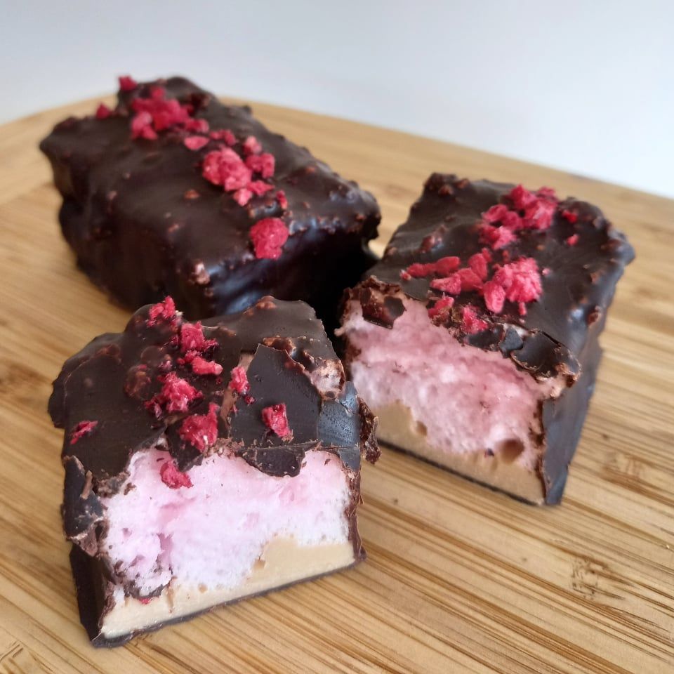 Chocolate raspberry almond base, raspberry fudge, fluffy raspberry marshmallow, dark chocolate drizzle & dry roasted almonds