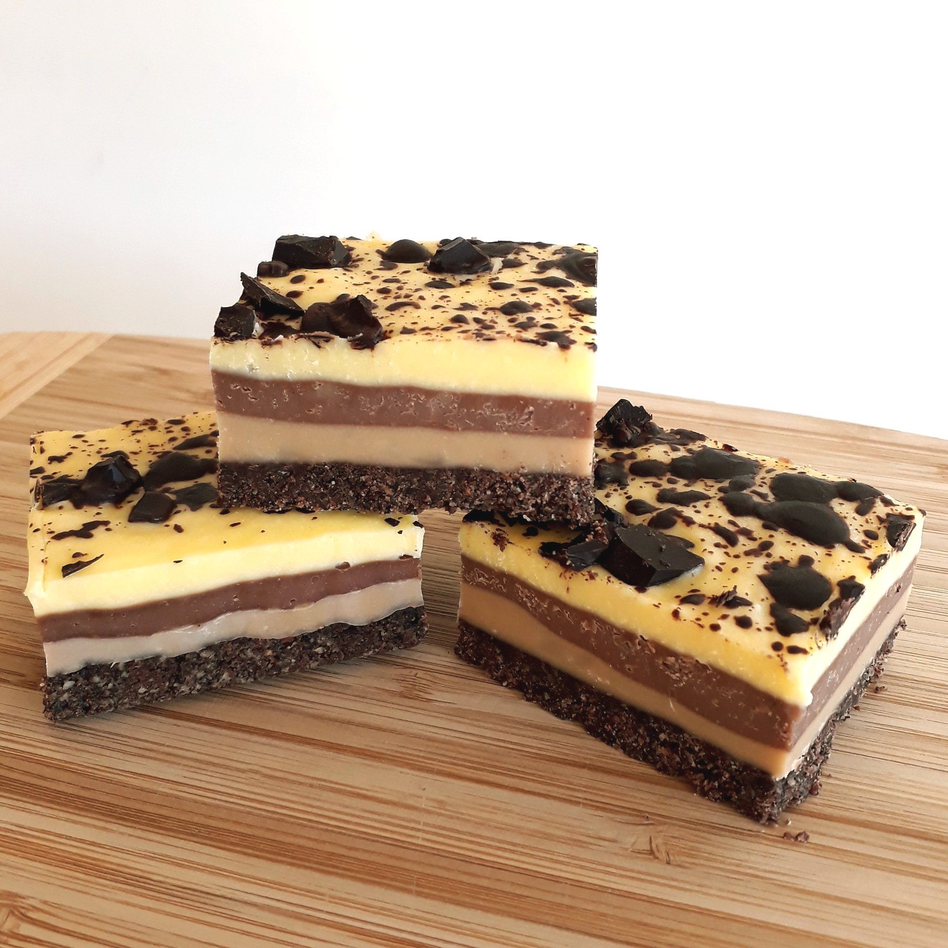 A chocolate peanut base, covered in chocolate nougat, caramel filling, topped with vanilla fudge and a sprinkling of chopped peanuts!