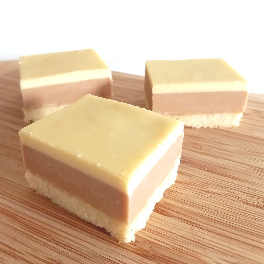 A delicious almond base, generous caramel filling with a white chocolate caramel fudge top