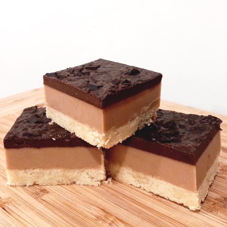 A delicious almond base, generous caramel filling, a chocolate fudge top with dark chocolate chunks