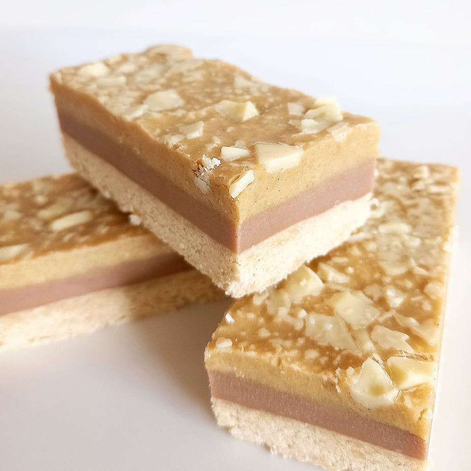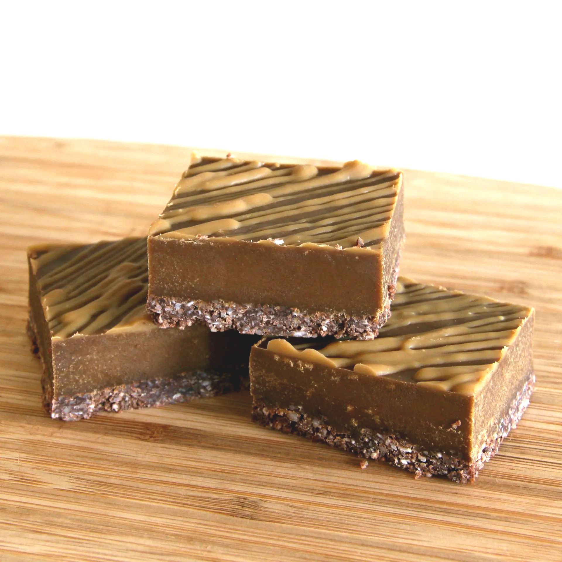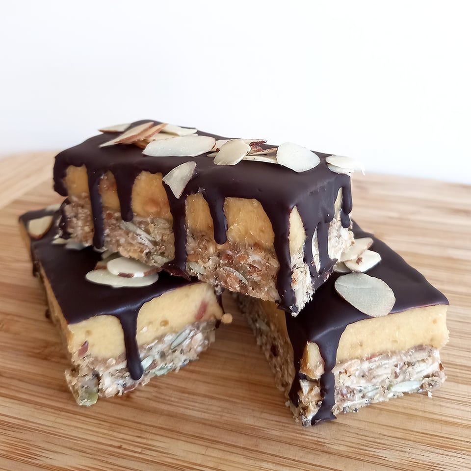 A delicious Keto granola base, vanilla peanut butter fudge centre with a layer of dark chocolate and topped with sliced almonds!