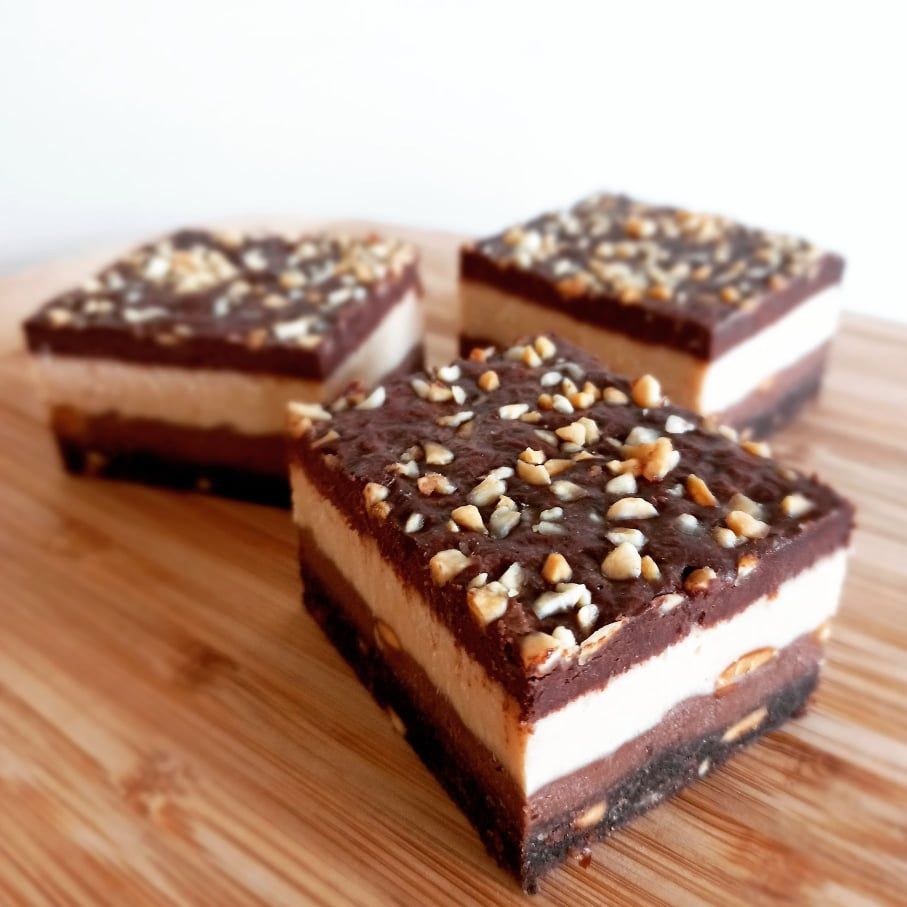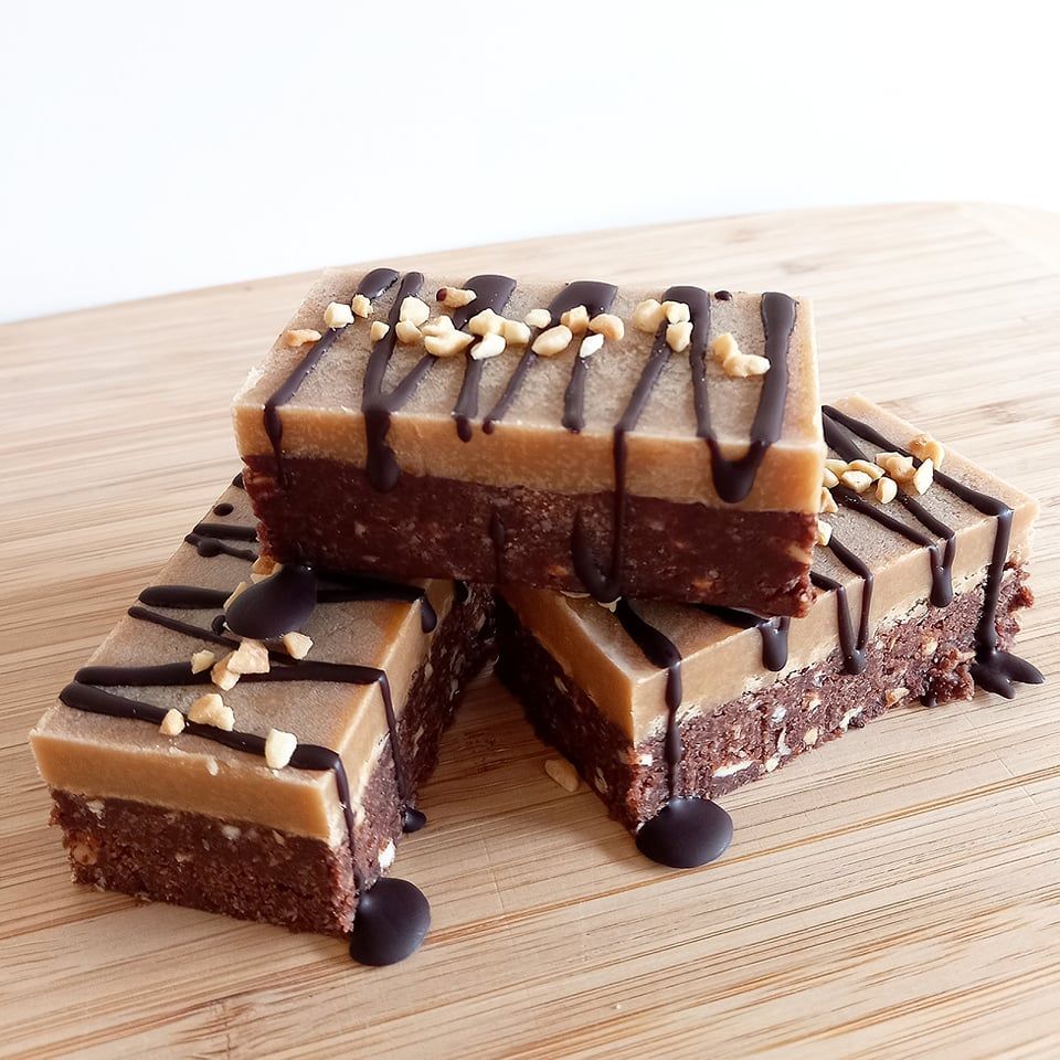 An unbaked, fudgy, peanut brownie base, a layer of peanut butter caramel, topped with a dark choc squiggle and a sprinkle of chopped peanuts