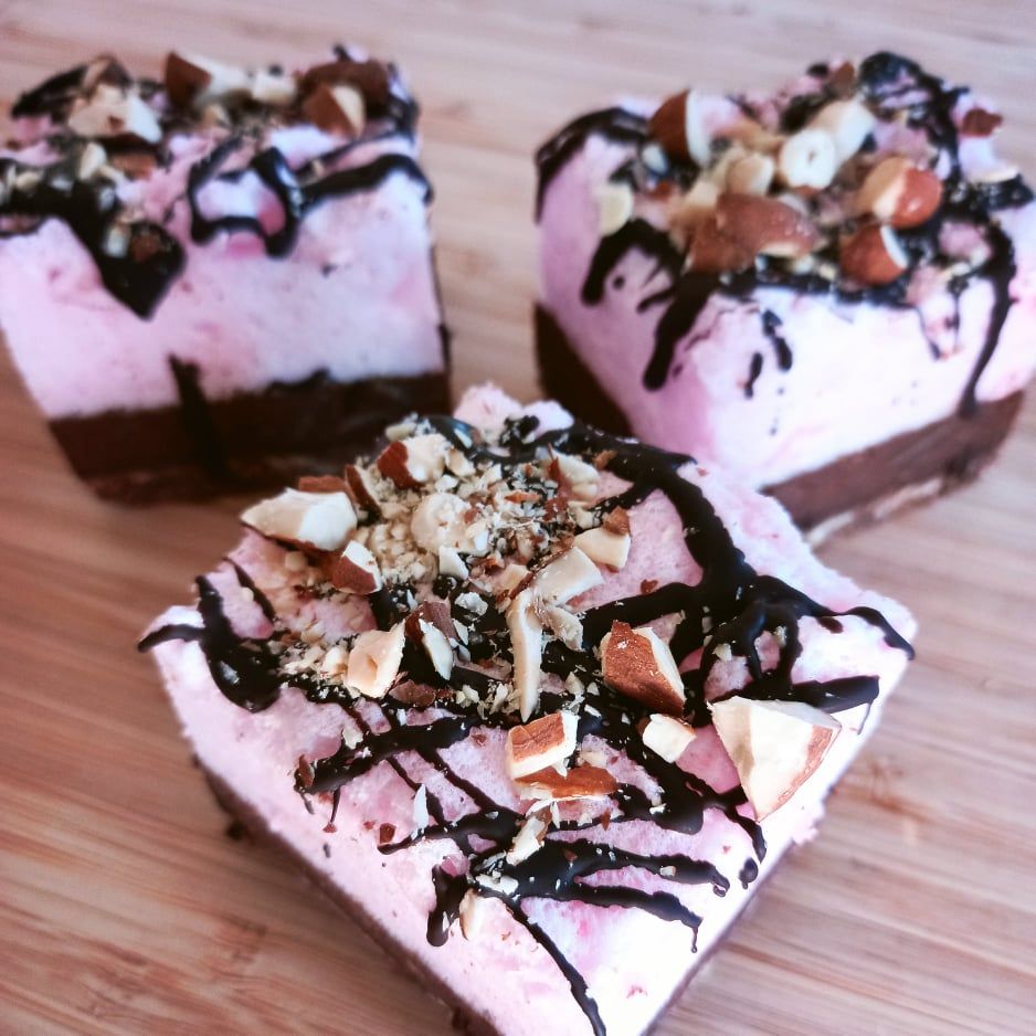 (v) A chocolate fudge base, peanut caramel, topped with a whipped strawberry coconut filling & finished with dark chocolate & f/d strawberry pieces.