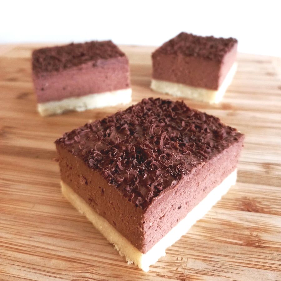 An almond biscuit base topped with a creamy mint mousse and covered in a layer of grated dark chocolate!