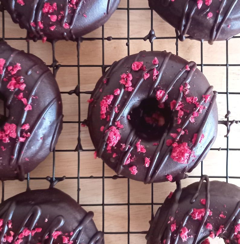 Almond donuts with chocolate ganache, a white choc drizzle and freeze dried raspberries