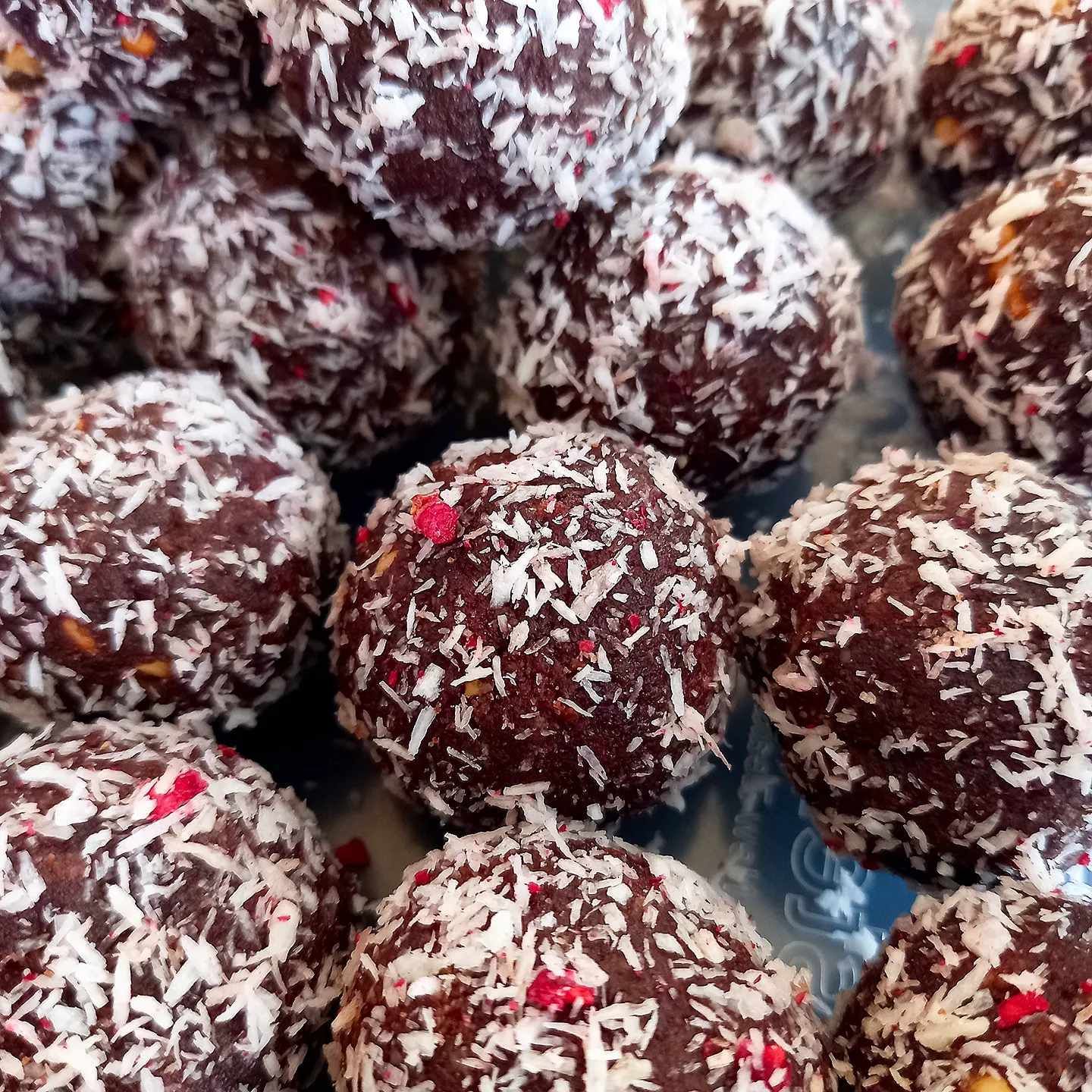 Delicious and soft, bite-sized morsels of chocolate, raspberry, coconut and peanut