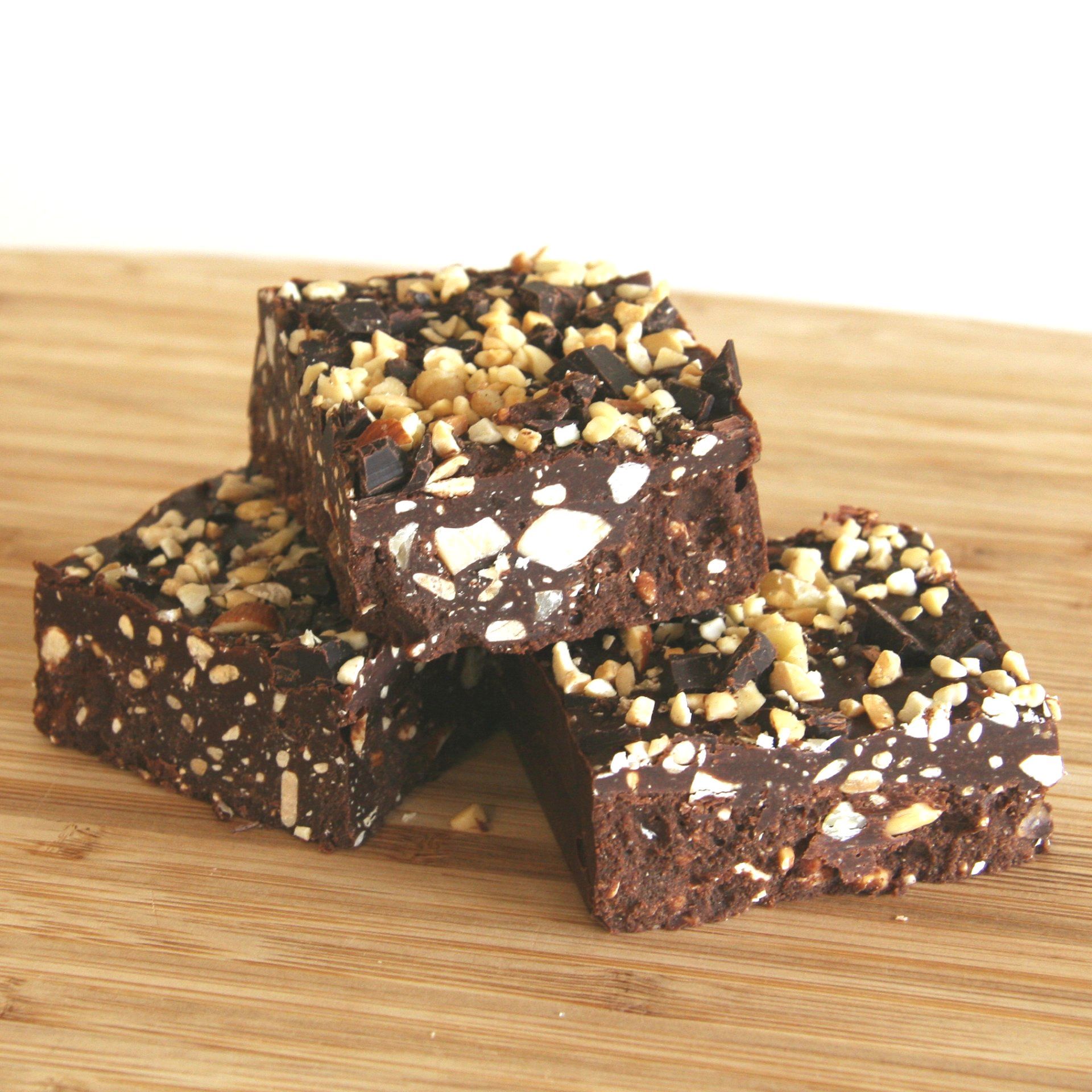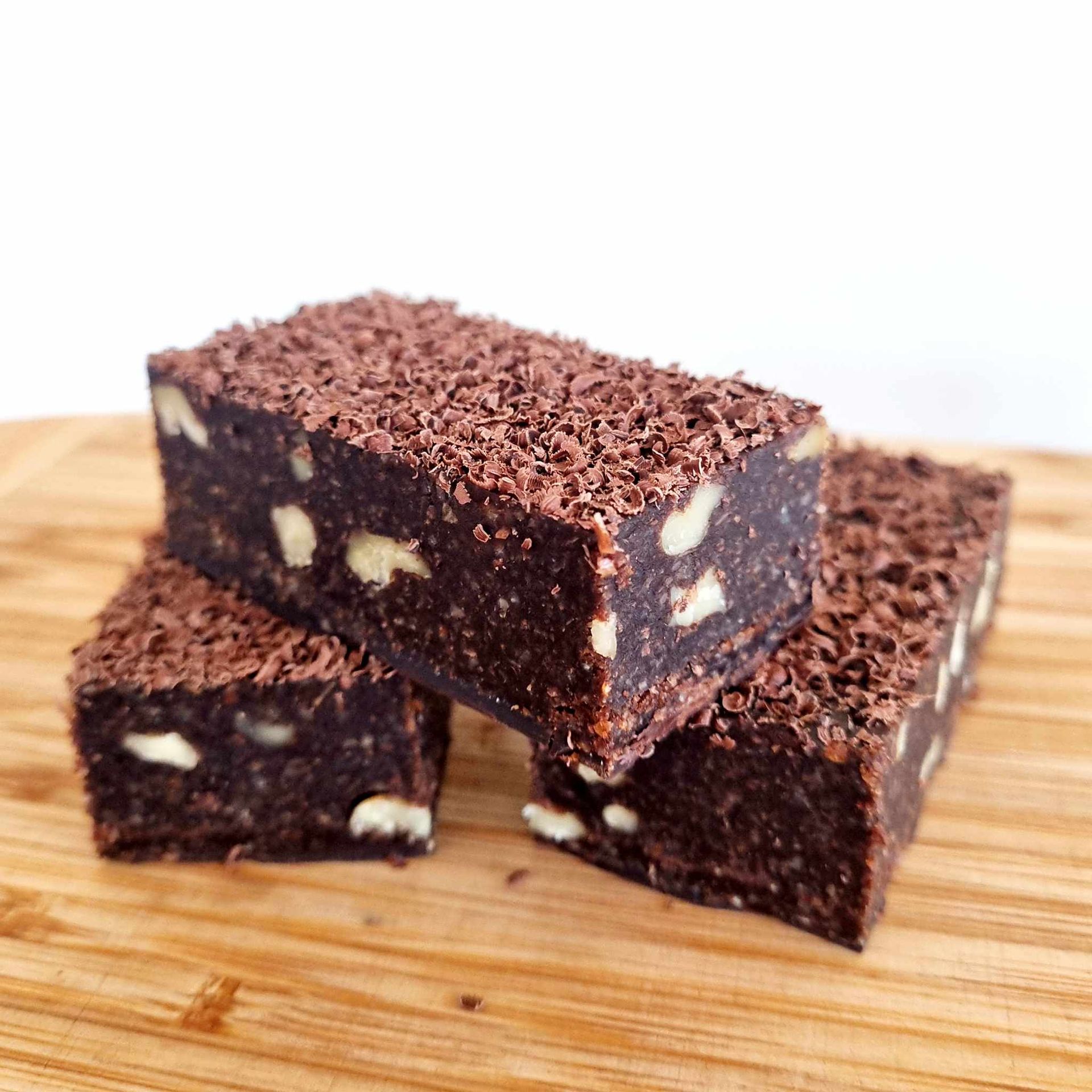 A decadent fudgy slice, with chunks of walnuts and a hit of espresso - all sitting on a thin, luscious layer of dark chocolate!