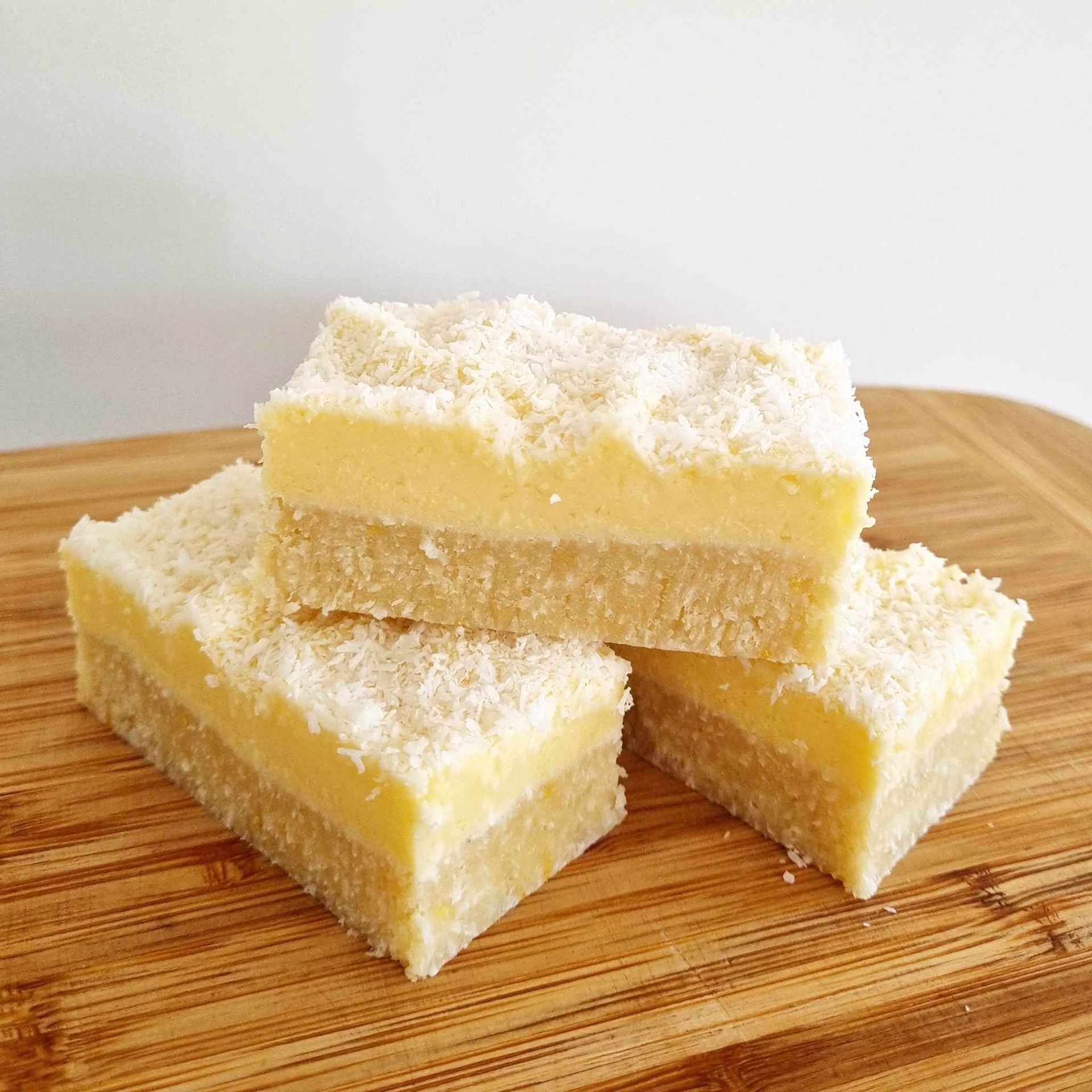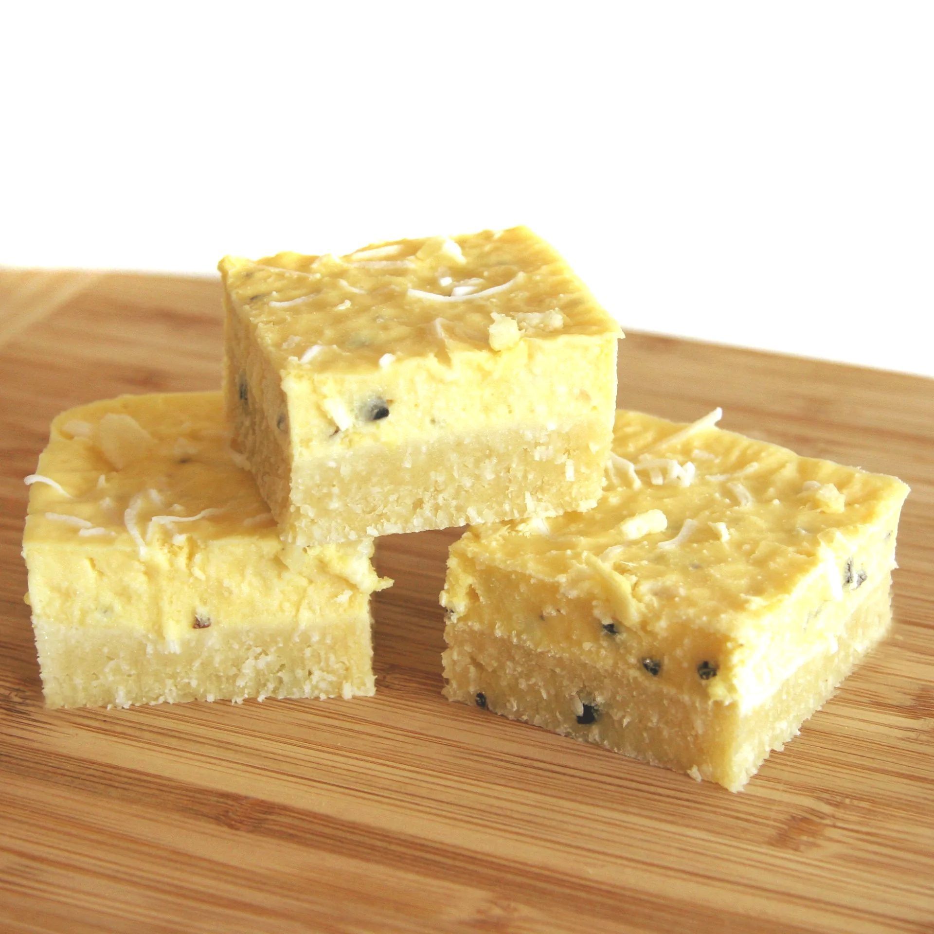 Homemade condensed "milk", almond and coconut base - topped with a zingy coconut-passionfruit top and sprinkled with coconut