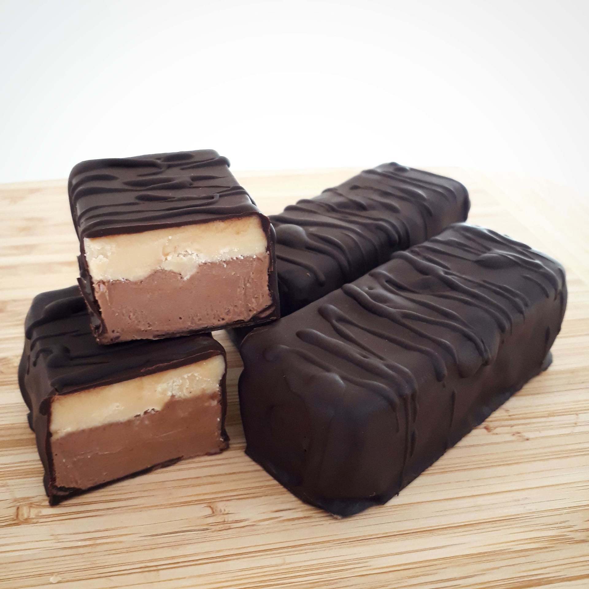 Sugarfree caramel layered with a smooth peanut chocolate nougat, covered in dark chocolate!