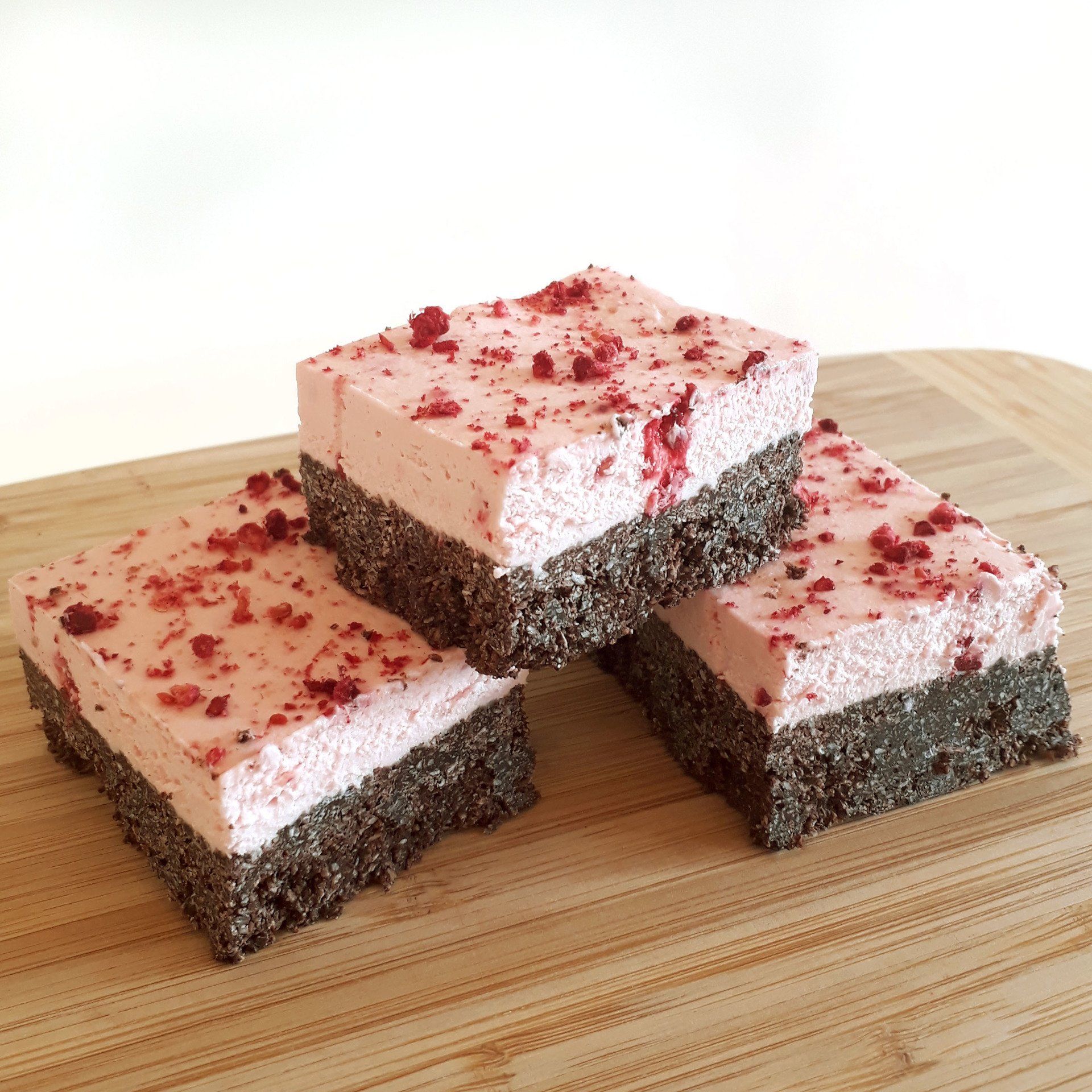 A decadent and rich, sugarfree berry fudge, with freeze dried raspberries and sitting on top of an almond biscuit base
